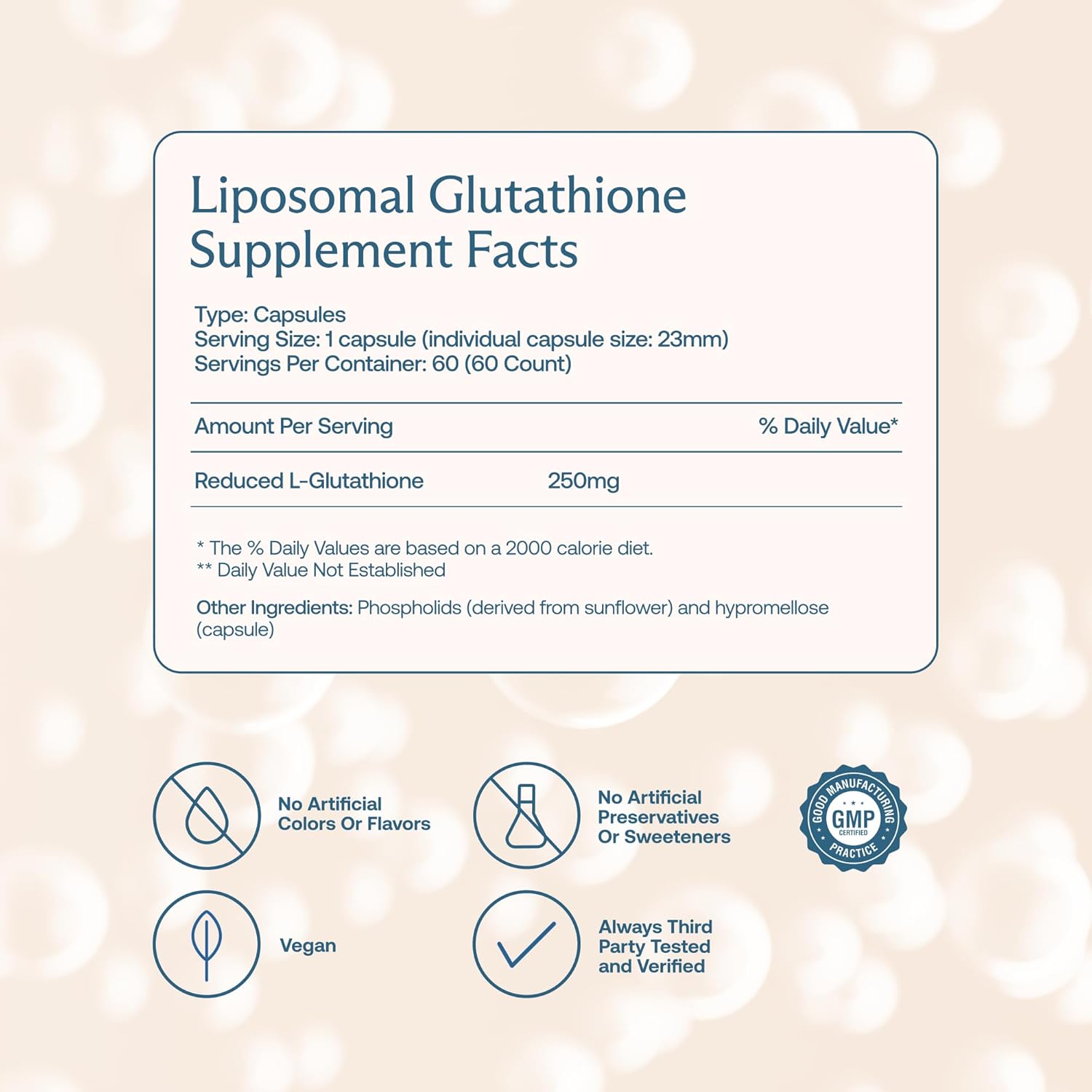 The manufacturer recommends one capsule daily, with or without food. Timing is flexible; consistency matters more than the specific time of day. Each capsule delivers 250 mg of reduced L-glutathione in a liposomal format, with 60 capsules per container providing a 60-day supply at the standard dose.