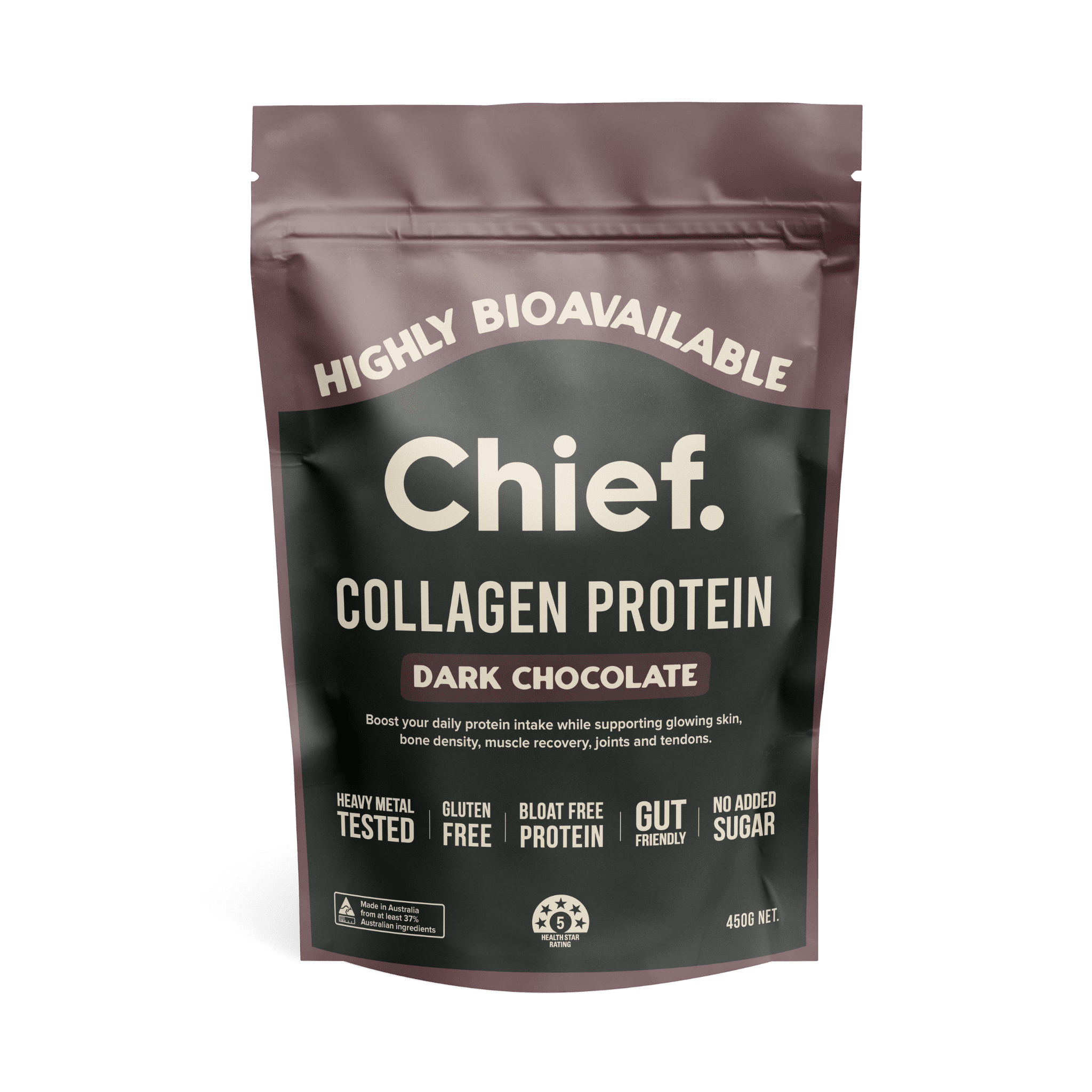 Chief Grass-Fed Collagen Protein Powder is a hydrolysed bovine collagen peptide derived from grass-fed cattle, providing approximately 27g of protein per 30g serving. This unflavoured powder contains types I and III collagen, the predominant forms found in connective tissue, and is designed for individuals seeking a clean protein source that can be incorporated into beverages, meals, and recipes without altering taste. It is particularly suited for those following athletic performance protocols, functional nutrition approaches, or anyone seeking additional collagen peptides as part of their daily protein intake.