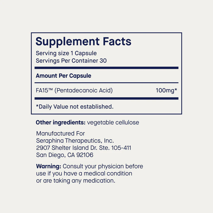 - Per capsule: 100mg FA15â„¢ (pure pentadecanoic acid/C15:0)