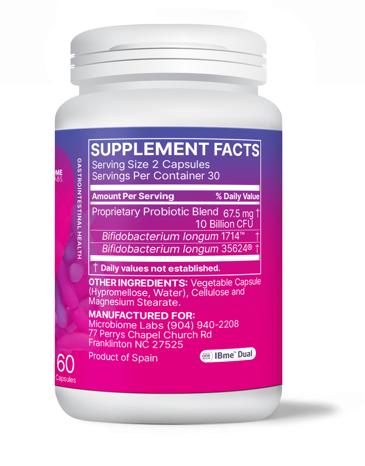 Probiotic supplement: Bifidobacterium longum 1714® and Bifidobacterium longum 35624®. Microbiome Labs dual-strain formula designed to support both digestive comfort and mood regulation through the gut-brain axis. Two clinically researched probiotic strains working together to support digestive wellness and stress response.