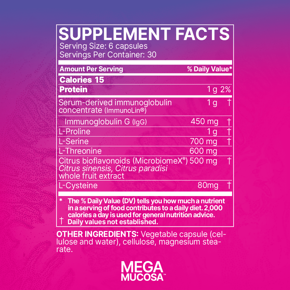 MegaMucosa is a mucosal barrier support supplement containing dairy-free immunoglobulins, L-glutamine, and a flavobiotic ingredient studied for its role in short-chain fatty acid production. It’s designed for people focused on digestive wellness who want targeted nutritional support for the intestinal mucosal system, particularly those working with practitioners on gut health protocols or managing periods of digestive stress.
