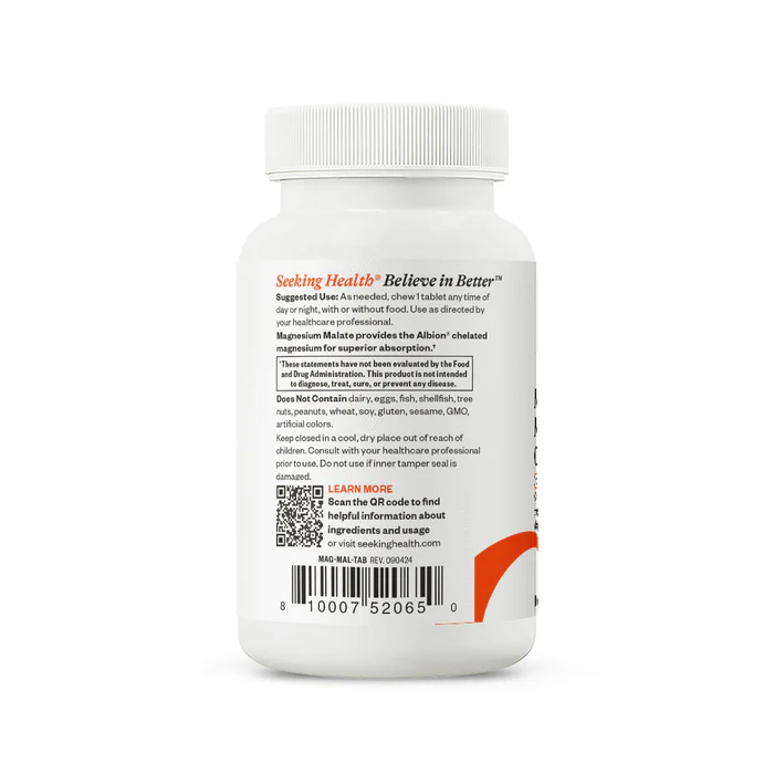 Seeking Health Magnesium Malate Chewable is a magnesium supplement that pairs magnesium with malic acid in a convenient chewable tablet. Malic acid is a naturally occurring compound found in many fruits and is involved in cellular energy metabolism, making it a commonly chosen carrier for magnesium in supplement form. This product is designed for anyone who wants a practical, swallowable-free way to get their daily magnesium without compromising on form quality.